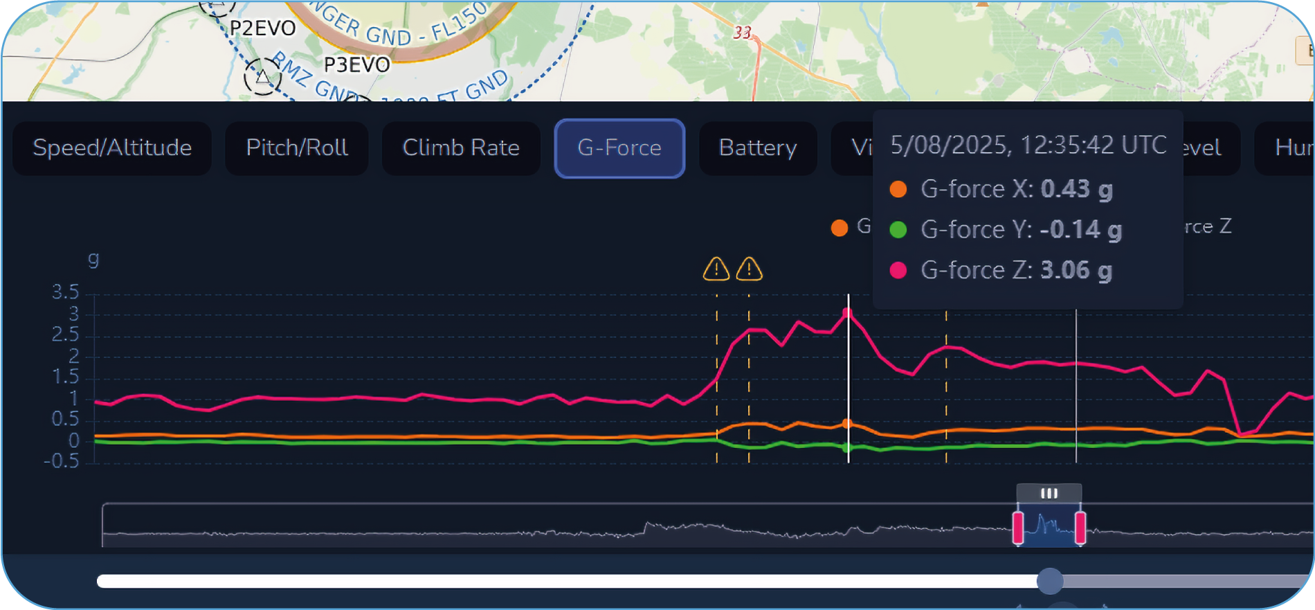 Detects and reports abnormal flight behavior (hard landings, unauthorized maneuvers, other irregular events).